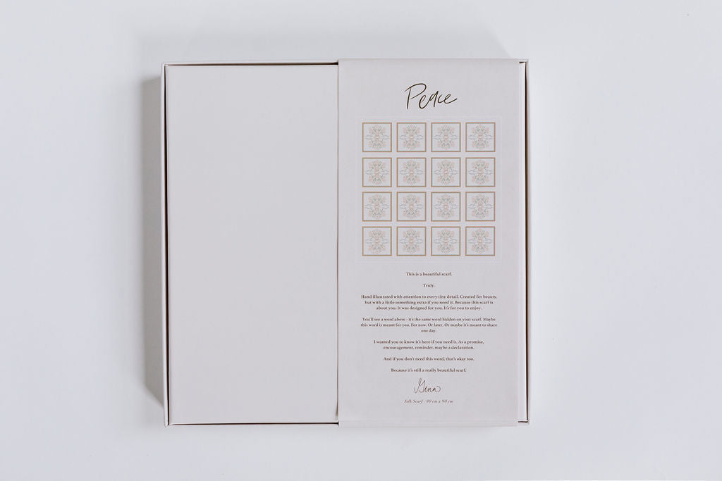 Our scarves are hand illustrated and made from 100% silk. Each scarf comes packaged in a beautiful box with packaging unique to each design. Each scarf also comes with a special word integrated into the design and on the box.